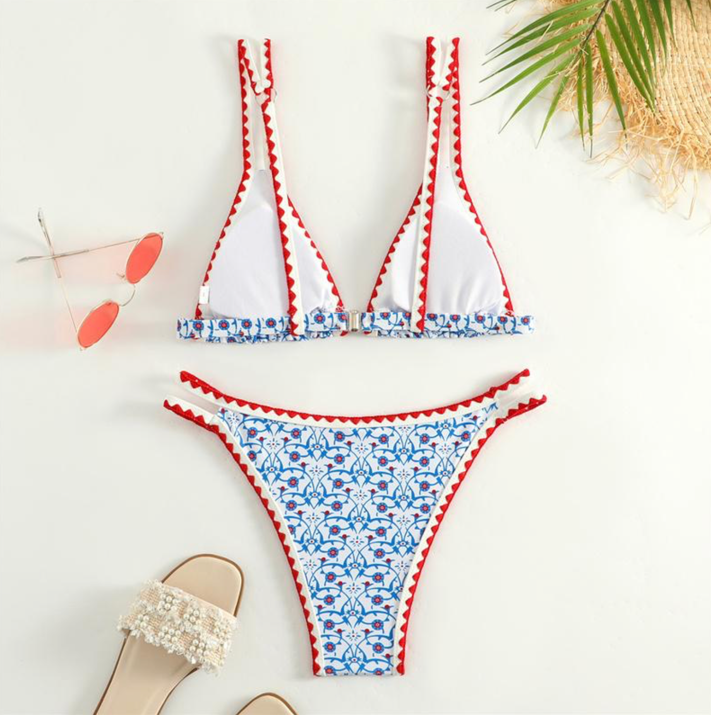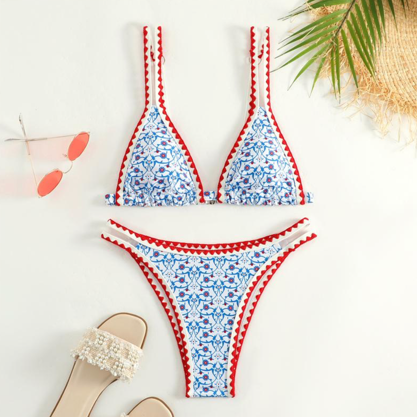 Channel effortless summer vibes with this beautifully patterned triangle bikini set, designed for those who love a blend of elegance and playfulness. Featuring a delicate floral print with eye-catching red scalloped trim, this bikini set is perfect for beach days, tropical getaways, and poolside lounging.
