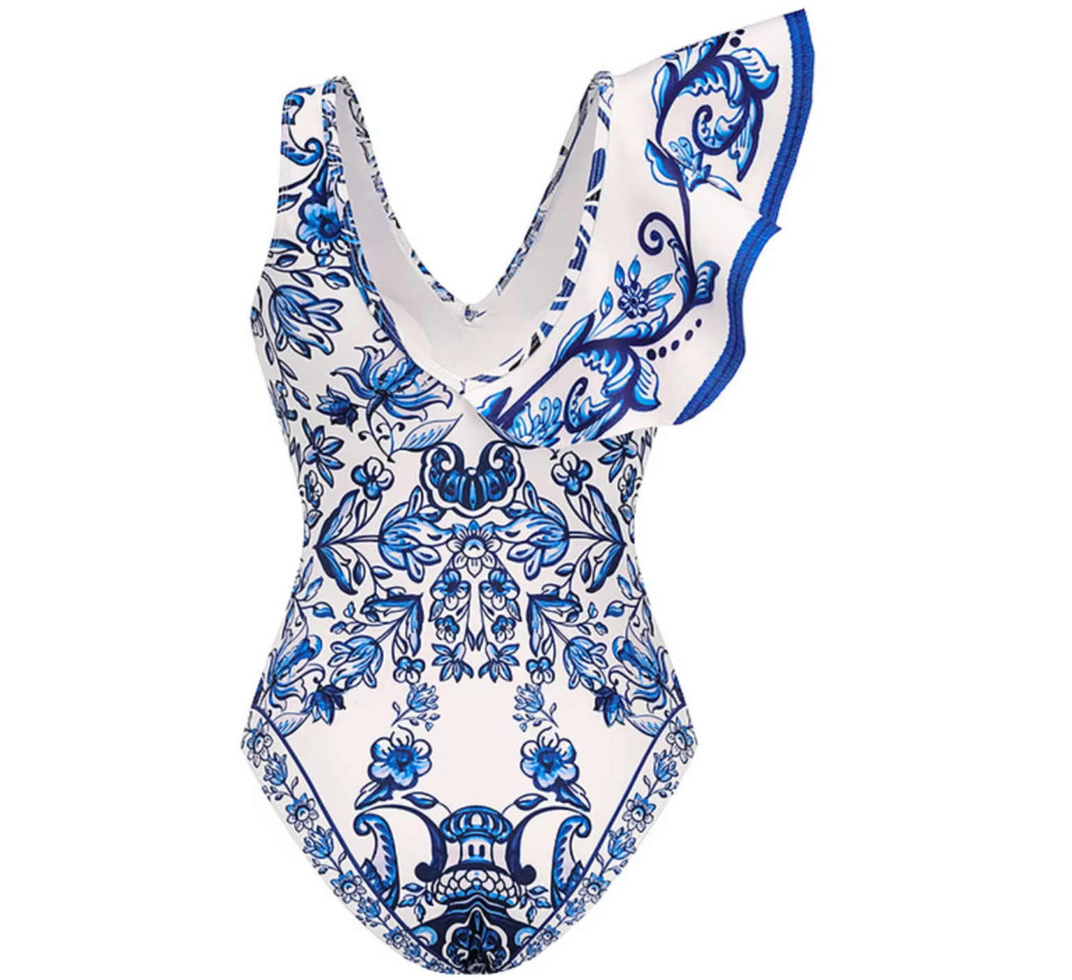 Turn heads with this stunning one-shoulder swimsuit, featuring a sophisticated blue-and-white baroque-inspired print and a dramatic ruffle detail. Designed for elegance and comfort, this swimsuit is perfect for beach days, resort lounging, or poolside glamour.